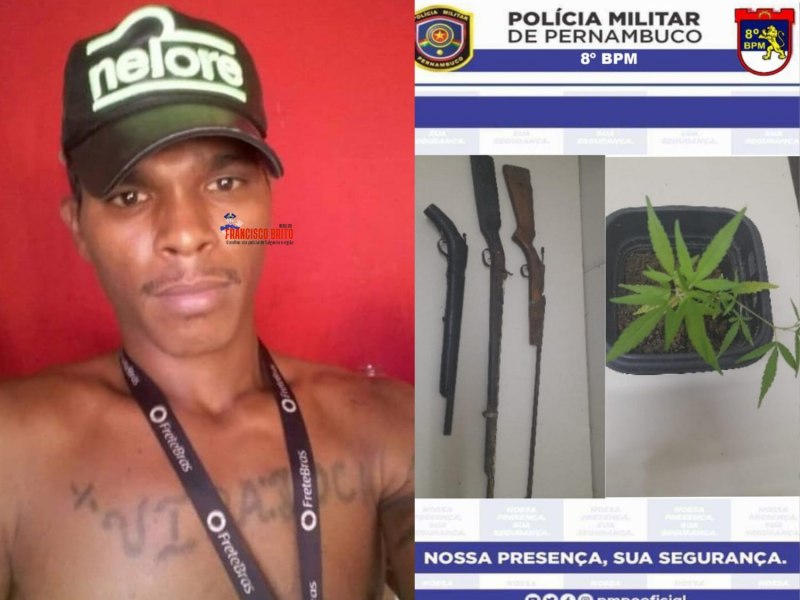 Na tarde desta sexta-feira (07/03), por volta das 14:00 horas, a Polícia Militar do 8º BPM, após informe das equipes do Núcleo de Inteligência (NI-23) e Malhas da Lei, prendeu um indivíduo identificado como Jair, que estava em posse de três armas de fogo industriais do tipo soca-soca e mantinha um pequeno plantio de maconha no quintal de sua residência. A prisão ocorreu no sítio Uri, zona rural de Salgueiro, no Sertão de Pernambuco.