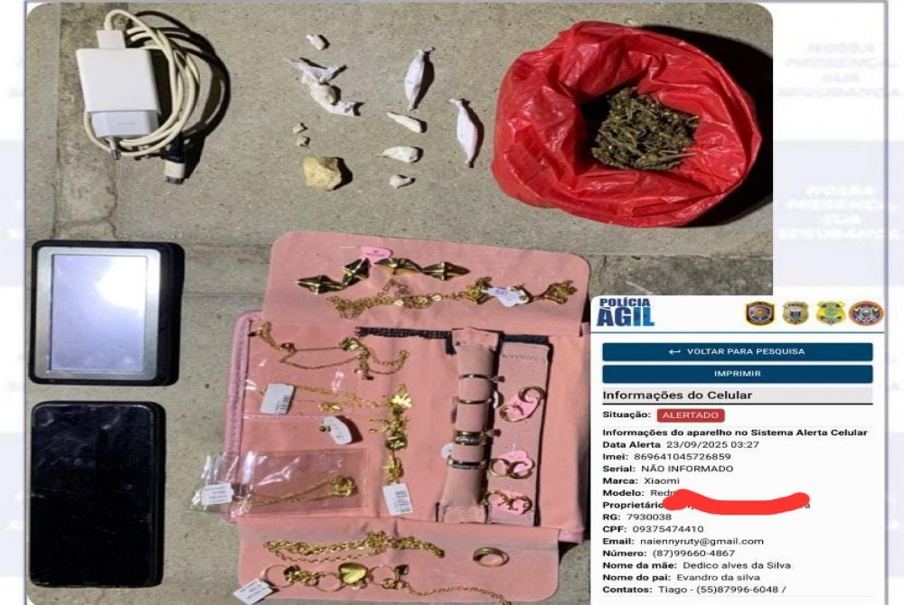 Com ele, foi apreendida uma mochila contendo parte dos bens furtados, além de um celular com restrição de queixa. Também foram encontrados entorpecentes: 9,5g de maconha, 7,4g de crack fracionado em porções e 2,3g de cocaína em quatro invólucros plásticos.