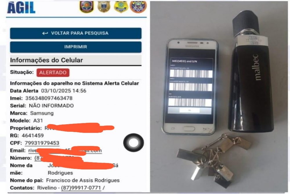Policiais militares das equipes GTI 2013, GATI, GT Operações, Malhas da Lei e ASI prenderam um homem suspeito de furto e recuperaram diversos objetos subtraídos de uma residência, na Rua Azemira Vieira da Silva, Centro de Cabrobó.