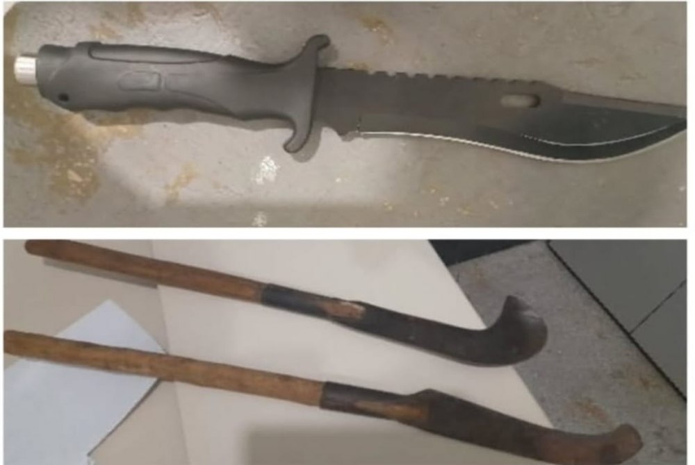 Durante a ocorrência, o autor qualificado no Boletim de Ocorrência Eletrônico foi detido e, após busca pessoal, os policiais localizaram uma faca em sua posse. Diante dos fatos, o envolvido, juntamente com a faca e as duas foices apreendidas, foi conduzido à Delegacia de Polícia Civil para a adoção das medidas legais cabíveis.