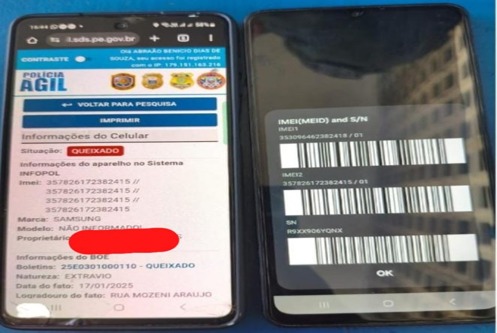 Durante a ação, ao abordar uma motocicleta, os policiais realizaram consulta do veículo e também de um aparelho celular por meio do aplicativo Polícia Ágil, momento em que foi constatado que o telefone possuía queixa.