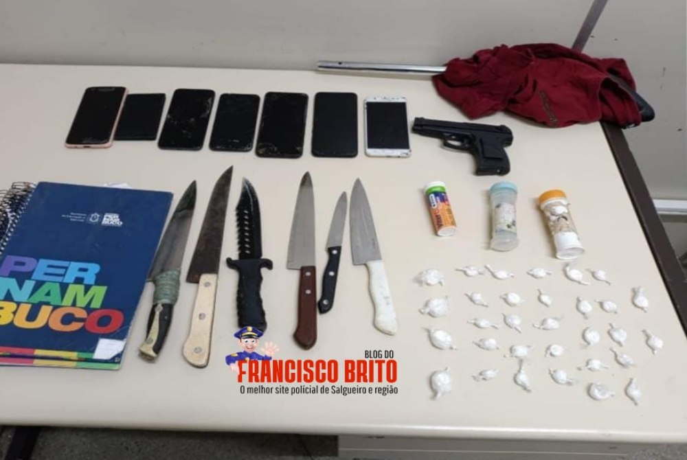 Com autorização dos indivíduos, os policiais realizaram diligência na residência dos envolvidos, onde foram encontradas outras facas, simulacros de arma de fogo e aparelhos celulares.