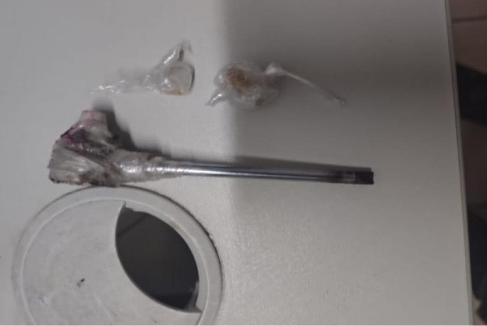 No momento em que a mulher abriu a bolsa, foram encontradas duas pedras de substância análoga ao crack, além de um cachimbo utilizado para o consumo da droga.
