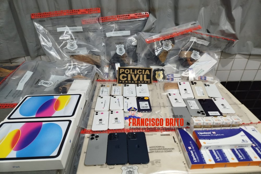 Além dos eletrônicos, os policiais encontraram 39 ampolas do medicamento conhecido como Mounjaro (tirzepatida), com indícios de falsificação e origem duvidosa, bem como uma caixa contendo canetas injetáveis para emagrecimento, também sem identificação regular de procedência.