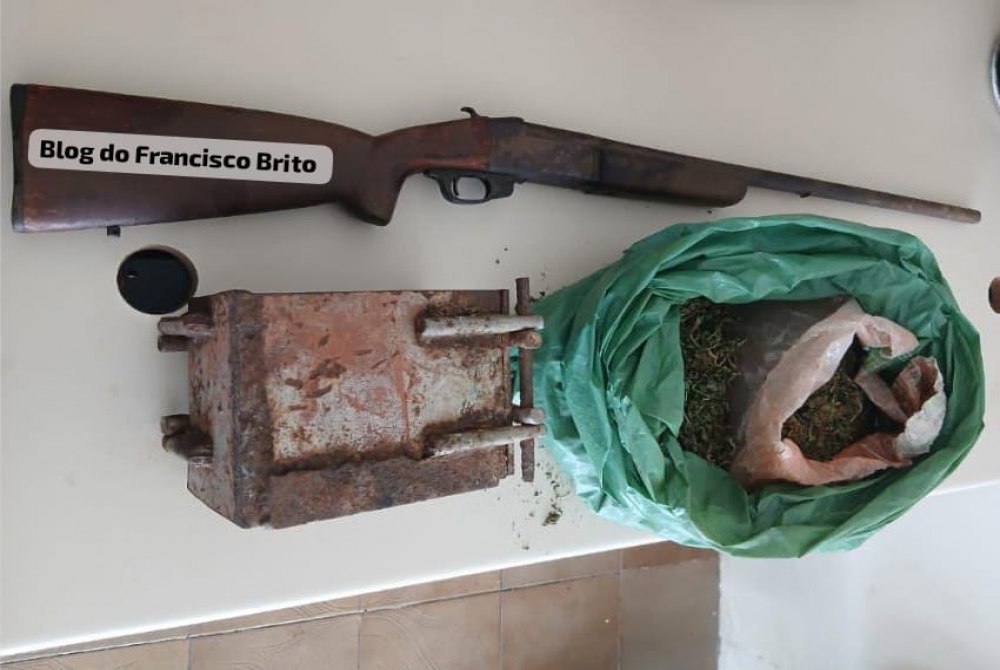 Durante varredura na área, os policiais encontraram aproximadamente 1,3 kg de substância análoga à maconha, além de uma prensa, localizada na propriedade de um dos envolvidos. Já com o segundo suspeito, foi apreendida uma espingarda da marca CBC, modelo 151, calibre 12, em desacordo com o Estatuto do Desarmamento (Lei 10.826/2003).