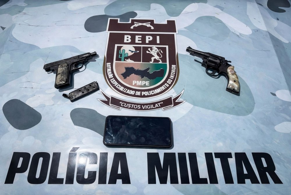 Com os indivíduos, os policiais apreenderam um revólver calibre 32, uma pistola calibre 365, além de um aparelho celular.