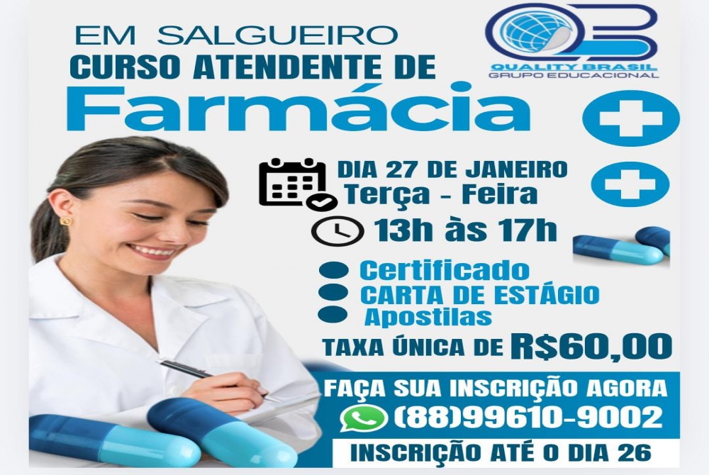 O Grupo Educacional Quality Brasil estará promovendo, em Salgueiro, o Curso de Atendente de Farmácia, uma excelente oportunidade para quem busca qualificação e ingresso no mercado de trabalho na área da saúde.